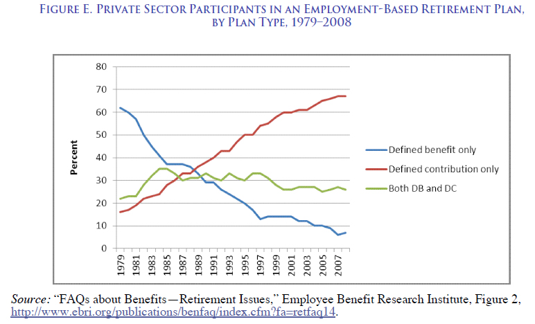 The graph above shows this sea change in private sector pensions. Among workers with some form of retirement plan, the share with only a defined benefit pension declined from 62 percent in 1979 to 7 percent in 2008. Sixty seven percent of workers with a retirement plan in 2008 had only a 401(k)-type defined contribution plan.