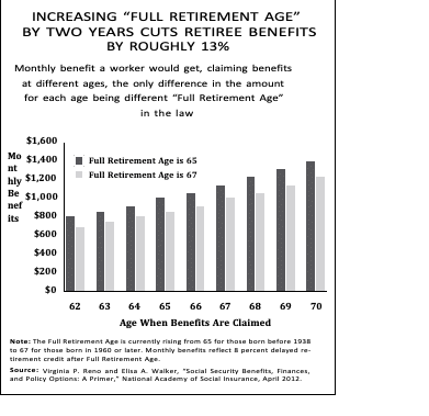 The nation is now in the middle of seeing the full retirement age rise to 67 — a 13 percent across-the-board benefit cut. It would be the height of irresponsibility to contemplate more changes in the same direction before the current benefit cut is fully phased in, and its impact on low-income workers, women, minorities, and everyone else has been carefully assessed.