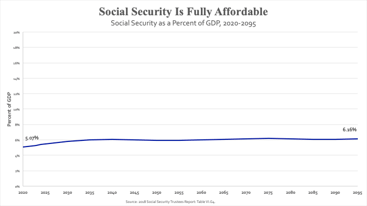 Social Security is extremely affordable. As the next chart makes clear, Social Security’s cost as a percentage of GDP is close to a straight horizontal line for the next three-quarters of a century and beyond.