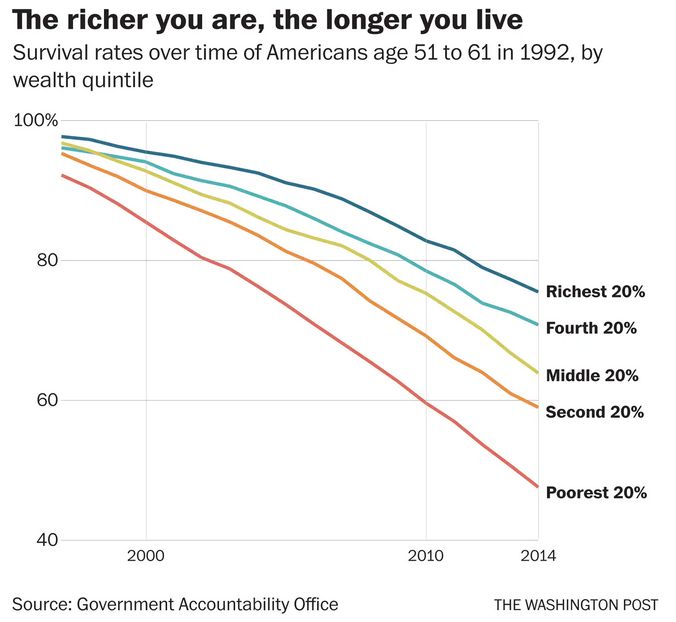 Over three-quarters of the richest 50-somethings in 1991 were still alive in 2014, the report found. But among the poorest 20 percent of that cohort, the survival rate was less than 50 percent, according to the analysis by the Government Accountability Office, a nonpartisan congressional research agency.