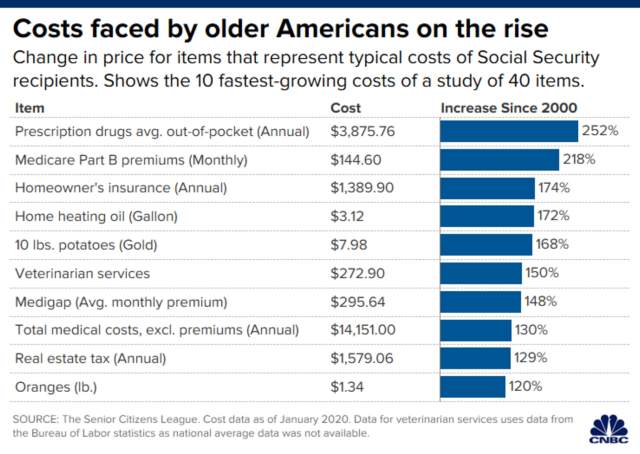 While benefits increased by 53% from January 2000 to January 2020, the costs of goods and services retirees use most jumped by 99.3%.