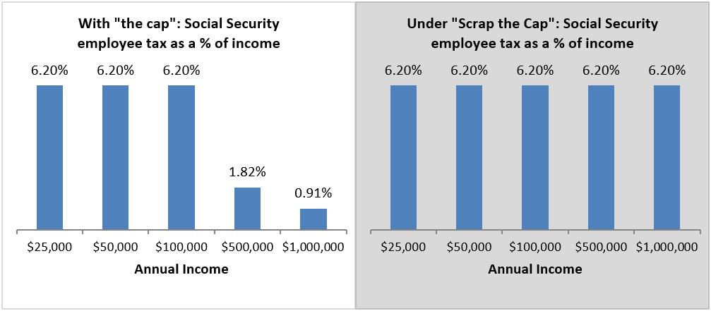 But we don’t all contribute equally. Social Security taxes are collected only on the first $147,000 of earnings each year. That means high earners – like CEOs and Wall Street executives – pay a lower tax rate than Joe or Jane Worker. That $147,000 ceiling – known as the “cap” – is arbitrary and unfair. If we simply “Scrap the Cap” so Social Security taxes were paid on all earnings, then high earners would pay their fair share – and that would enable us to strengthen Social Security benefits for future generations.